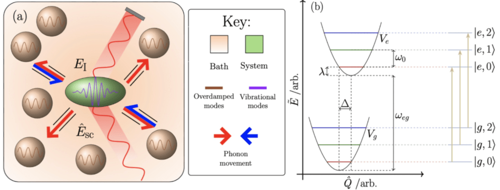 Our recent publication, entitled ‘Phonon signatures in photon correlations’, concerns observing genuine quantum behaviour in a molecular photon counting experiment. We model, through rigorous application of theory, a two level electronic system each with three vibrational levels continuously driven by a laser field which results in emission of a photon beam. We then calculate the detection probability for single photons, and pairs of photons at simultaneous and different times. We show that, through anti-bunching of photon correlation, that genuine quantum effects emerge from the open quantum system. In contrast, we observe more classical bunching behaviour from the phonons. In addition, we consider cross-correlations between the photons and phonons leading to suppression or enhancement of vibrational and electronic signatures.
